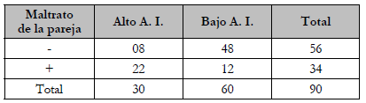 Con el propósito de establecer la asociación estadística entre el abuso infantil (A. I.) y el maltrato de la pareja (M. P.), utilizamos el chi cuadrado (X2). Los resultados de la investigación, que aparecen representados a continuación, confirman la hipótesis.