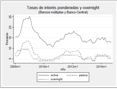 En la siguiente figura se presenta la evolución de las tres tasas de interés en el período comprendido entre enero de 2008 y septiembre de 2014, para un total de 81 observaciones mensuales. La media de la tasa de interés overnight en ese período fue de 6.04%, con un valor máximo de 9.5% y un mínimo de 4.0%. La media de la tasa de interés activa en ese período fue de 15.59%, con un valor máximo de 25.17% y un mínimo de 10.74%. El promedio de la tasa de interés pasiva fue de 7.02%, con un valor máximo de 13.49% y un mínimo de 3.79%.