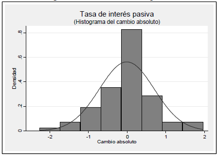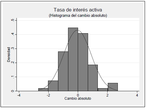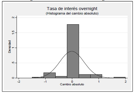 El cambio absoluto de las tasas de interés activa y pasiva se distribuye normalmente. Un análisis de normalidad basado en la asimetría y la curtosis no permite rechazar la hipótesis nula de normalidad de esas variables. En contraste, el cambio absoluto de la tasa de interés de política monetaria no se distribuye normalmente. La prueba basada en asimetría y curtosis permite rechazar la hipótesis nula de normalidad para el caso de la tasa de interés overnight. Ese resultado se debe una concentración de valores alrededor de cero por encima de lo esperado en una distribución normal.