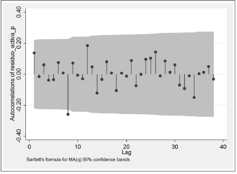 También se realizó un correlograma a los residuos del modelo de regresión de la tasa de interés activa para determinar si existe correlación serial. El resultado del correlograma revela que los residuos no tienen información sistemática adicional. Esto confirma nuevamente que los parámetros estimados son eficientes.