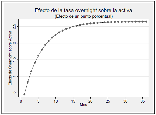 Los parámetros permiten señalar que el multiplicador de corto plazo (T = 1) es igual a ß = 0.457. Esto significa que por cada punto porcentual que se incremente la tasa de interés overnight, la tasa de interés activa se incrementará en ese mismo mes en casi medio punto porcentual. Con el transcurrir del tiempo el efecto del aumento de un punto de la tasa de interés overnight produce un incremento de . Esto significa un aumento de 2.66 puntos porcentuales en la tasa de interés activa. La evolución del efecto (multiplicador) a lo largo del tiempo se presenta en la siguiente figura. Nótese que en los primeros doce meses se llega a un valor cercano al ajuste de largo plazo. La mitad del ajuste ocurre en los primeros 3.7 meses (i.e., )