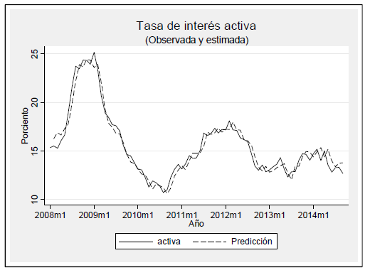 El modelo econométrico permite realizar predicciones de la tasa de interés activa, dado el movimiento de la tasa overnight. La bondad de ajuste se muestra en la siguiente figura. Cabe resaltar que desde mayo de 2014 la tasa de interés activa se encuentra por debajo del valor pronosticado. Esto significa que otros factores, no recogidos por la tasa de interés de política monetaria .–que se ha mantenido constante desde finales de agosto de 2013–., explican el descenso de las tasas de interés. En otras palabras, si fuera por la tasa de interés overnight la tasa de interés activa observada fuese .–en promedio–.0.9 puntos porcentuales más alta.