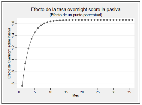 La comparación de la reacción de ambas tasas de interés permite concluir que en el corto plazo la tasa de interés pasiva reacciona a los movimientos de la tasa overnight en mayor magnitud que la tasa de interés activa. Además, la tasa de interés pasiva llega a su nivel de equilibrio de largo plazo más rápido. No obstante, cabe resaltar que en el largo plazo la magnitud del cambio –en términos absolutos– de la tasa de interés activa es mayor que el cambio de la tasa de interés pasiva.