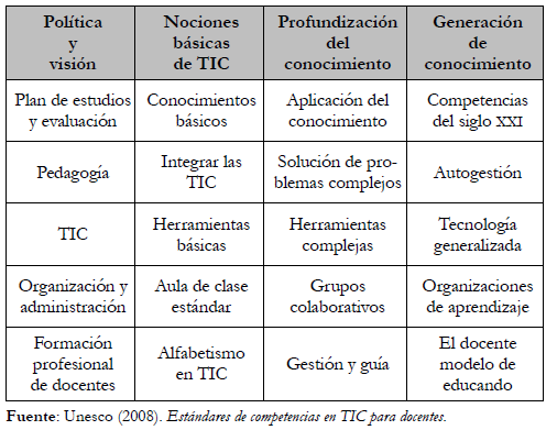 Por su lado, la Unesco (2008) desarrolló unos estándares de competencias en TIC para docentes el cual tiene como finalidad mejorar la práctica de los docentes en todas las áreas de su desempeño profesional, combinando las competencias en TIC con innovaciones en la pedagogía, el plan de estudios (currículo) y la organización escolar. El objetivo general de este proyecto es mejorar la práctica de los docentes y la calidad del sistema educativo con la finalidad de contribuir al desarrollo económico y social, por consiguiente para lograr todo esto es indispensable que el docente adquiera las competencias que se presentan en la próxima tabla: