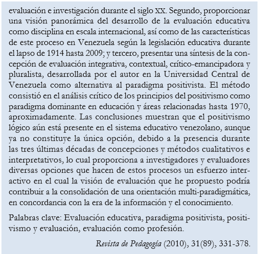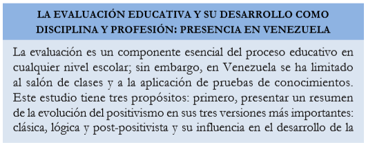 Salcedo, H. (2010). La evaluación educativa y su desarrollo como disciplina y profesión: presencia en Venezuela. Revista de Pedagogía, 31, 89, 331-378.