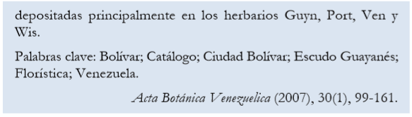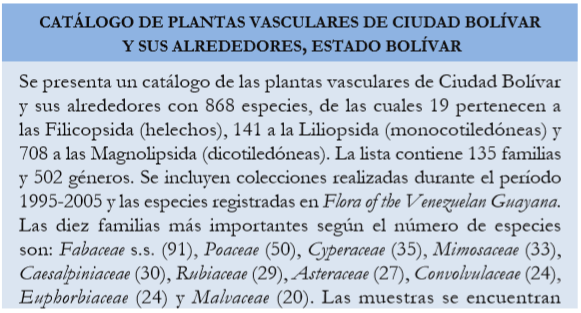 Díaz, W. & Delascio-Chitty, F. (2007). Catálogo de plantas vasculares de Ciudad Bolívar y sus alrededores. Acta Botánica Venezuelica, 30, 1, 99-161.