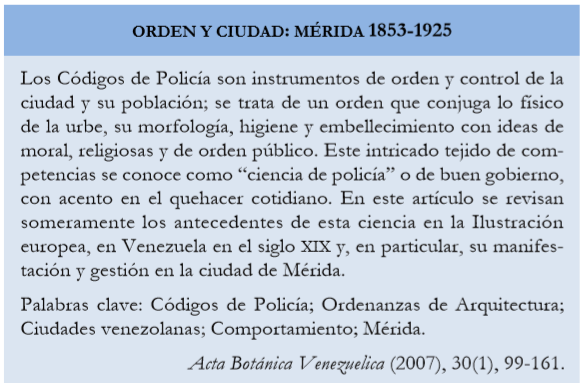 Calderón, E. (2008). Orden y ciudad: Mérida 1853-1925. Argos, 25, 49, 26-44.