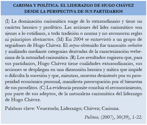 Villarroel, G. & Ledezma, N. (2007). Carisma y política. El liderazgo de Hugo Chávez desde la perspectiva de sus partidarios. Politeia. 30, 39, 1-22.