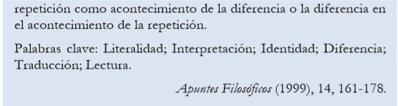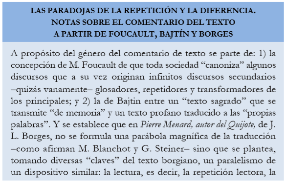Larrosa, J. (1999). Las paradojas de la repetición y la diferencia. Notas sobre el comentario del texto a partir de Foucault, Bajtin y Borges. Apuntes Filosóficos, 14, 161-178. Lerat, P. (1997). Las lenguas especializadas. Barcelona: Ariel.