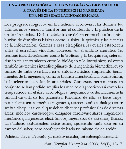 Bustamante, J. (2003). Una aproximación a la tecnología cardiovascular a través de la interdisciplinariedad: una necesidad latinoamericana. Acta Científica Venezolana, 54, 1, 12-17.