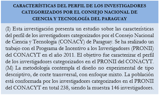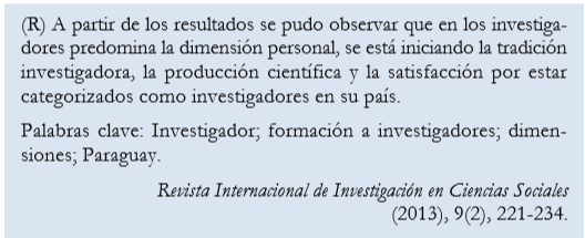 Jiménez, V. & Duarte, S. (2013). Características del perfil de los investigadores categorizados por el Consejo Nacional de Ciencia y Tecnología del Paraguay. Revista Internacional de Investigación en Ciencias Sociales, 9(2), 221-234.