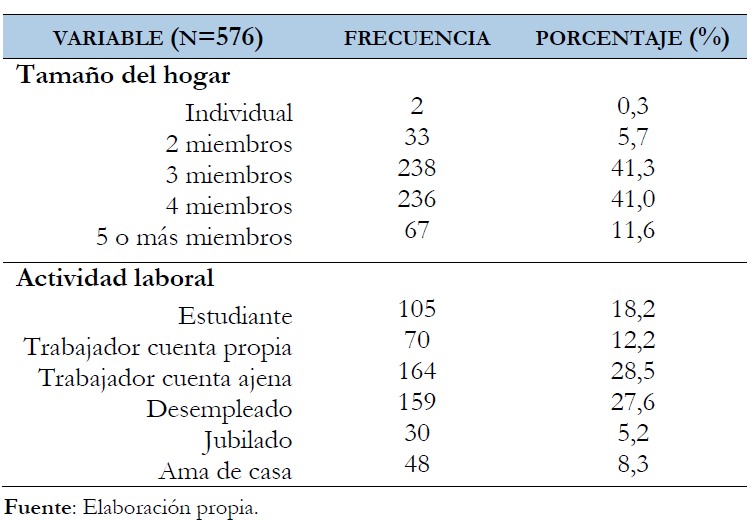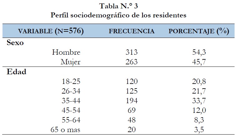 La tabla n.° 3 muestra las características sociodemográficas de los residentes. El 54,3% de los encuestados han sido hombres, destacando un gran número de residentes en los grupos de edades de 35-44, 26-34 y de 18-25 años. El 41,3% viven en un hogar con 3 miembros, y el 41,0% en una casa con 4 miembros. En cuanto a la actividad laboral, el 28,5% trabajan por cuenta ajena, pero hay un grupo importante de personas desempleadas (27,6).