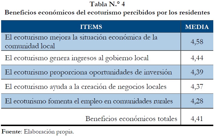En la tabla n.° 4 pueden observarse los beneficios económicos del turismo comunitario obtenidos por los residentes a través del ecoturismo. Según se muestra, la comunidad local apoyará el turismo según los beneficios que pueda percibir de la actividad (Nukoo y Ramkissoon, 2011). En este sentido, todos los ítems del cuestionario sobrepasan los cuatro puntos sobre cinco de la Escala de Likert, por lo que todos están de acuerdo en las afirmaciones de la tabla n.° 4. Por tanto, el ecoturismo mejora la situación económica de la comunidad rural, coincidiendo esto con otros estudios previos (Ahmed y Krohn, 1992; Gursoy y Rutherford, 2004). De acuerdo con Lindberg (1991) y Puerta Cañaveral (2007), el ecoturismo mejora la disposición de los gobiernos a participar en los proyectos turísticos y fomenta la autofinanciación de los recursos turísticos. Por su parte, el ecoturismo también proporciona nuevas oportunidades para invertir, sobre todo, a través de la creación de nuevos negocios locales (Davis et al., 1988; Kwan y McCartney, 2005), que a su vez, generan empleos (Dyer et al., 2007; Gu y Ryan, 2008). En este aspecto, según Tyrrell y Spaulding (1984), la creación de empleo es uno de los principales beneficios generados por el turismo para las comunidades rurales y en nuestra investigación ocupa el último lugar dentro de los beneficios económicos, por lo que la hipótesis H1 no es soportada en el Monumento Natural Saltos de la Damajagua.