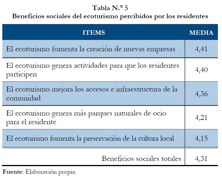 Por su parte, en la tabla n.° 5 aparecen los beneficios sociales percibidos por la comunidad rural. Todos ellos sobrepasan la valoración media de cuatro puntos sobre cinco, por lo que todos están de acuerdo en la afirmación de cada ítem. Así, el ecoturismo fomenta la creación de nuevas empresas para las comunidades locales (Davis et al., 1988). Por su parte, genera actividades para que los residentes participen, fomentando así la cultura local (Puertas Cañaveral, 2007). De acuerdo con Ross y Wall (1999), el ecoturismo mejora los accesos hacia y entre las comunidades cercanas, y fomenta la construcción de nuevas infraestructuras y espacios de ocio, que buscan mejorar el turismo, pero también el bienestar de los residentes. Aunque, cabe destacar que según Tosun (2002), durante la temporada alta turística la población rural se sienten marginados de su comunidad.