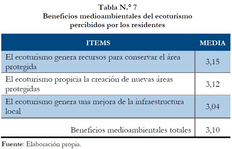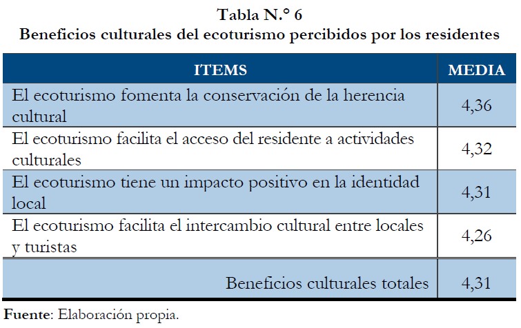 En otro sentido, la tabla n.° 6 muestra los beneficios culturales obtenidos por la población residente. Así, se puede observar que el ecoturismo fomenta la conservación de la herencia cultural de las comunidades locales (Gilbert y Clark, 1997), por lo que la hipótesis H2 de esta investigación es soportada en el Monumento Natural Saltos de la Damajagua. Además, el ecoturismo facilita el acceso a la comunidad rural a las actividades culturales (Dyer et al., 2007; Stronza y Gordillo, 2008), generando también un impacto positivo en la identidad local y facilitando el intercambio cultural entre el residente y el turista (Besculides et al., 2002).