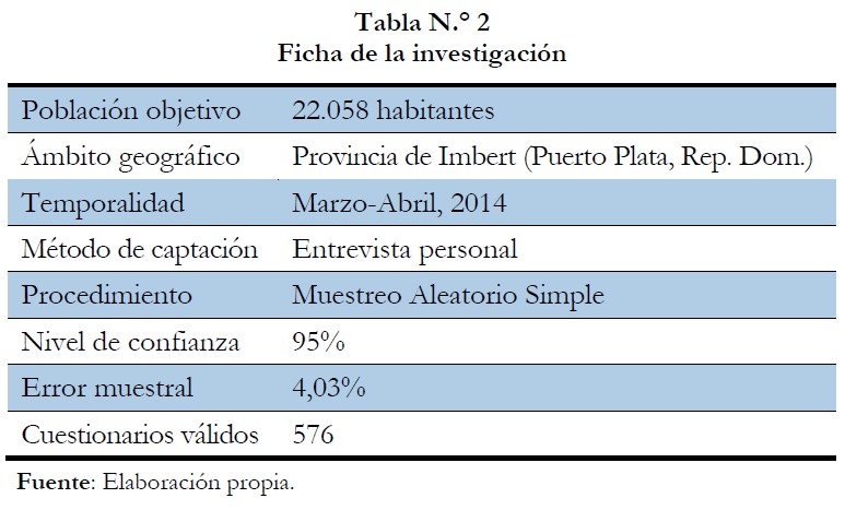 El cuestionario se realizó entre los meses de marzo y abril de 2014 por parte de uno de los autores de esta investigación, que además tenía como misión explicar el propósito del estudio a los encuestados y responder las posibles preguntas del cuestionario que no comprendieran estos. En total, el número de cuestionarios válidos fue de 576 (tabla n.° 2), obteniendo un error muestra del 4,03% y un nivel de confianza del 95%, teniendo en cuenta que el número de residentes es de 22.058 habitantes (Oficina Nacional de Estadística, 2010).