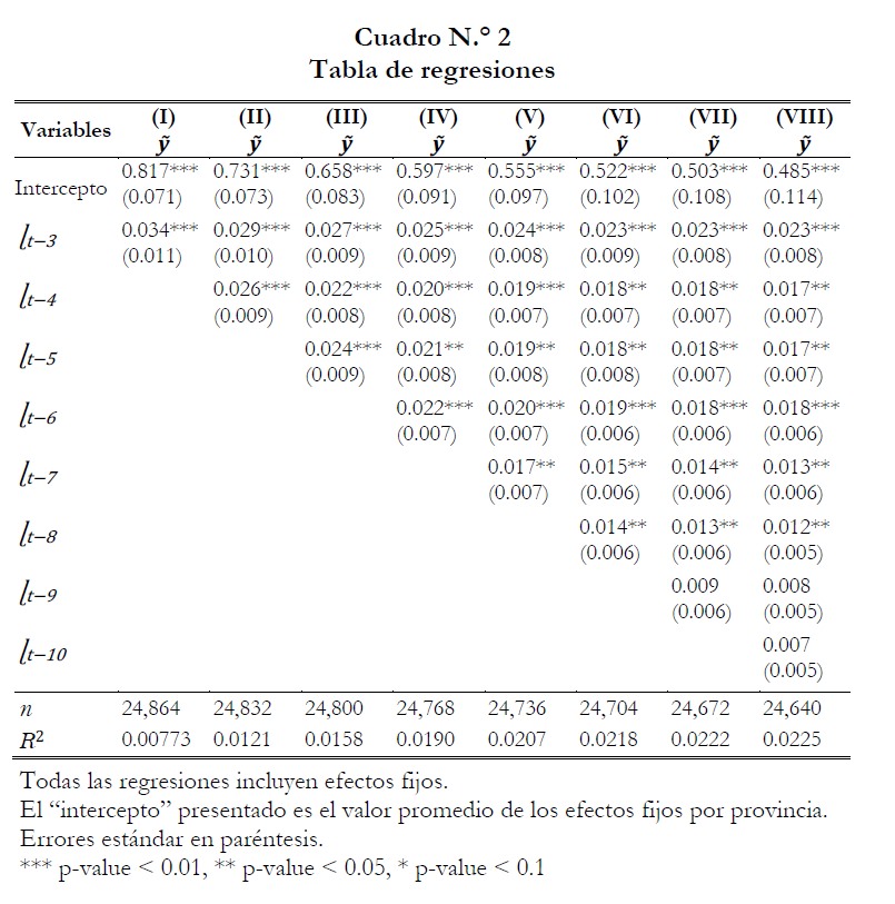 En la tabla N.°2 se muestran los resultados de nuestras estimaciones. Al disponer de un panel de datos de dimensiones (semana, provincia) realizamos una estimación con efectos fijos para controlar las diferencias atemporales entre provincias que pueden explicar . Las estimaciones indican que con las variaciones de en la lluvia acumulada semanal, a partir con rezagos desde tres semanas hasta dos meses, podemos explicar las variaciones en . Hemos seleccionado 3 semanas como rezago mínimo debido a las etapas de desarrollo del vector, desde su gestación hasta su etapa adulta es necesario esperar entre dos semanas y un mes (WHO, 2009).