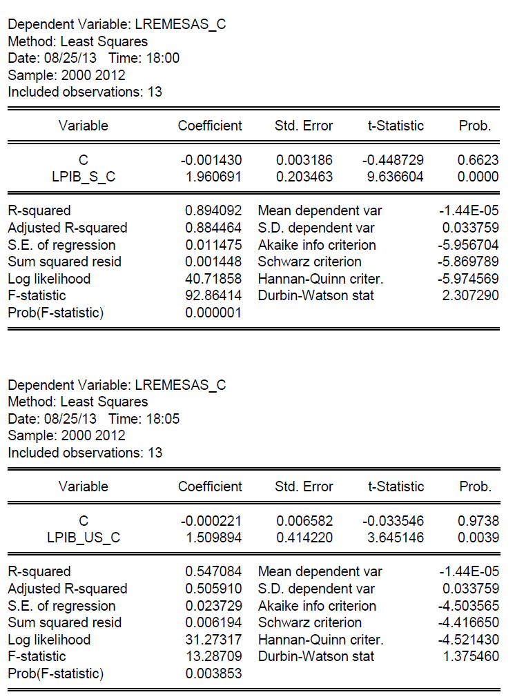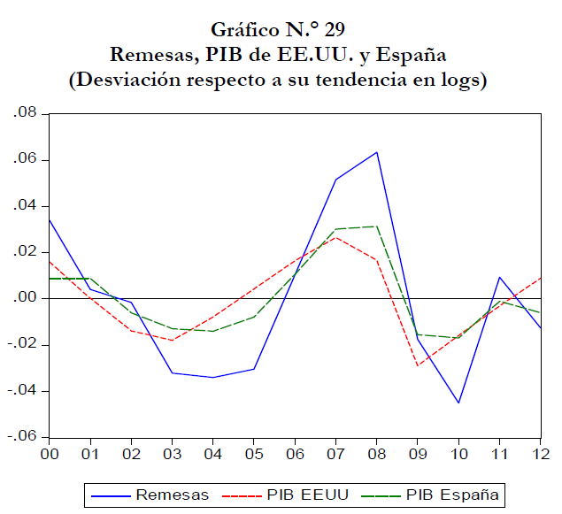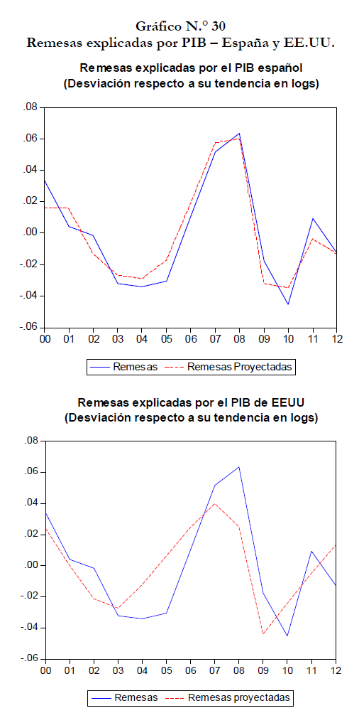 Se estima también un modelo de determinantes de remesas en función de las características sociodemográficas y del mercado laboral (e. g., si está o no empleado). En términos macroeconómicos se estima un modelo que hace depender las remesas de la desviación del PIB actual del PIB potencial tanto de los Estados Unidos como de España, con lo cual se cuantifica la relación de las remesas y el ciclo económico de los países receptores de inmigrantes.
