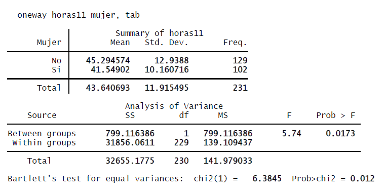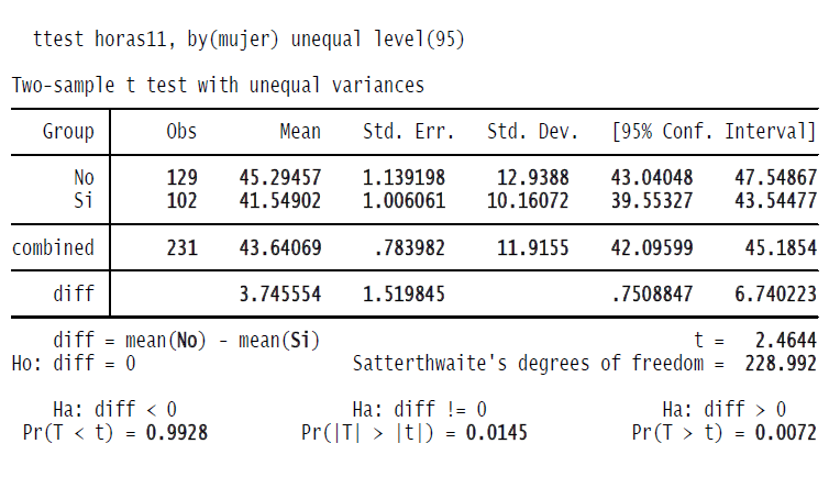 El género y la cantidad de hijos son variables que influyen sobre la cantidad de horas disponibles para trabajar. Se realizó una prueba de igualdad de medias, pero previamente se verificó si existe igualdad de varianzas para poder realizar la prueba de medias. Los resultados [ver anexo 1] arrojaron que la varianza es distinta para ambos grupos, por lo tanto, se llevó a cabo la prueba de medias con varianzas desiguales. El resultado arrojó [ver anexo 2] que se puede rechazar la hipótesis nula de igual media entre mujeres y hombres en las horas trabajadas. La mujer (41.6 horas) trabaja en promedio menos horas a la semana que el hombre (45.3 horas).