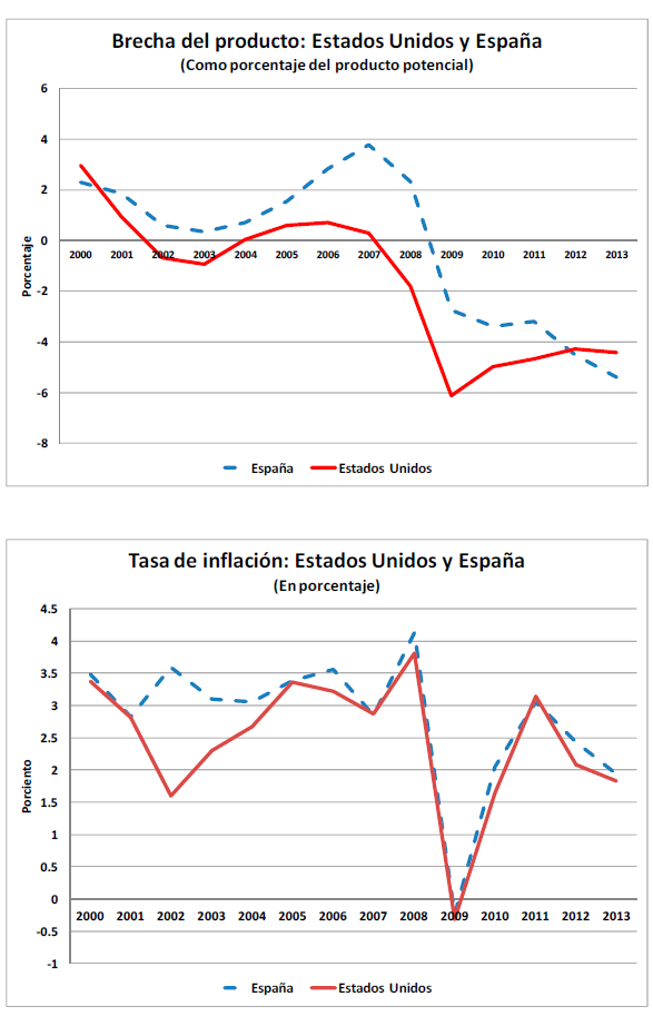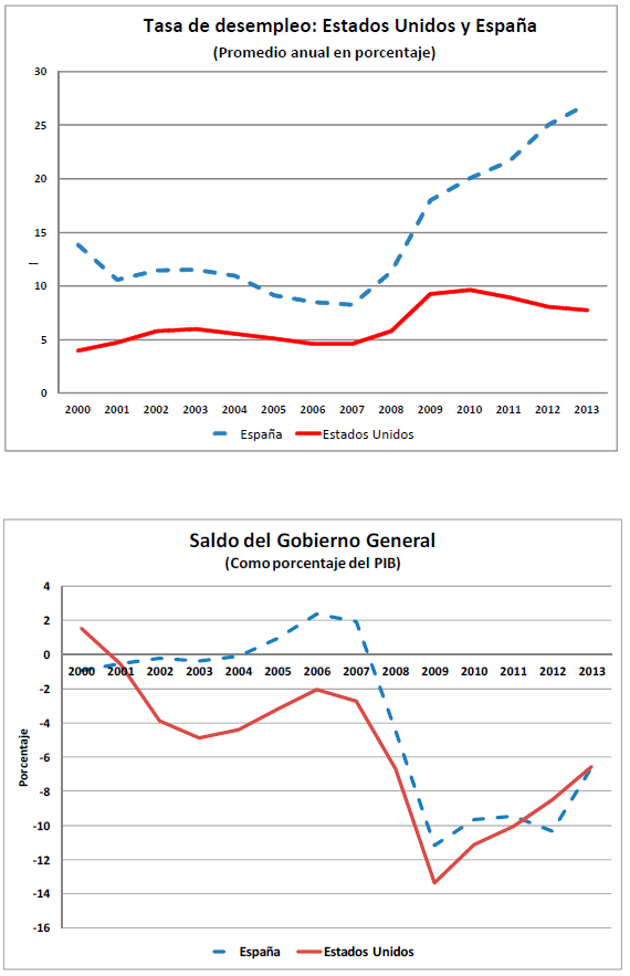 España entró en recesión en 2009, descendiendo el PIB en un -3.7% al mismo tiempo que los precios cayeron en -0.2%. Esa recesión económica, provocada por el programa de consolidación fiscal y la incertidumbre generada por la crisis bancaria, llevó la tasa de desempleo de 8.3% en 2008 a un 18% en 2009. A partir de ese momento el desempleo ha mantenido una tendencia ascendente, alcanzando un 27% en 2013. La caída del empleo y de la demanda agregada provocó que el déficit de la cuenta corriente de la balanza de pagos pasara de un déficit de un 10% en 2007 a un déficit de 4.8% en 2009 y, posteriormente, a un superávit de un 1.1% del PIB en 2013.