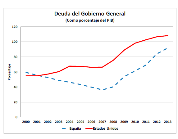 El PIB español desaceleró su ritmo de crecimiento hasta situarse en un 0.9% en 2008. El gobierno español decidió enfrentar esa desaceleración provocada por la reducción de los créditos mediante el aumento del gasto público. Las autoridades ejecutaron un amplio programa de pequeñas obras de infraestructura para enfrentar la desaceleración de la economía. Entre 2007 y 2009, las finanzas públicas pasaron de un superávit de un 1.9% del PIB a un déficit de un 11.2% del PIB, explicado ese deterioro por la combinación de un incremento de los gastos y una disminución de los ingresos tributarios. Las autoridades aplicaron posteriormente un programa de consolidación fiscal, compuesto por aumentos de impuestos y reducción de gastos corriente y de capital, que redujo sostenidamente el déficit del gobierno general hasta colocarlo en 6.6% del PIB. A pesar de esa disminución, la crisis financiera y el rescate de grandes instituciones financieras llevó la deuda pública de un 36.3% del PIB en 2007 a un 91.8% en 2013.