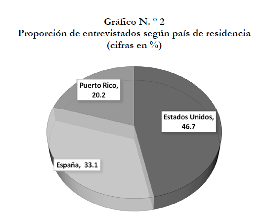 La distribución por país de las encuestas realizadas se muestra en el siguiente gráfico. El 46.7% de los encuestados son emigrantes dominicanos que residen en Estados Unidos, el 33.1% en España y el restante 20.2% en Puerto Rico. Los emigrantes dominicanos tienen, en promedio, 12 años residiendo en su país de destino. En promedio, en los Estados Unidos los entrevistados indicaron estar residiendo desde hace 14 años, en Puerto Rico 17 años y en España 6 años.