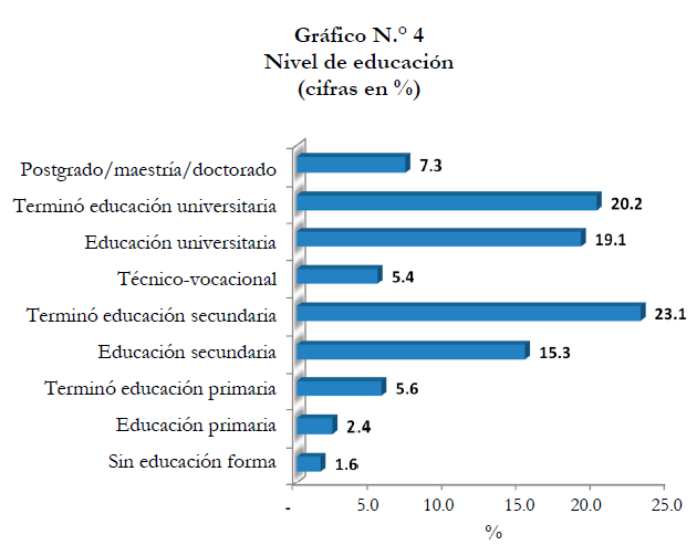 En cuanto al nivel de educación, la mayoría de los entrevistados cuenta con algún nivel de educación (96.1%). Sin embargo, el 53.5% no posee educación universitaria, es decir, para este grupo de personas el máximo nivel de educación alcanzado es el nivel secundario.