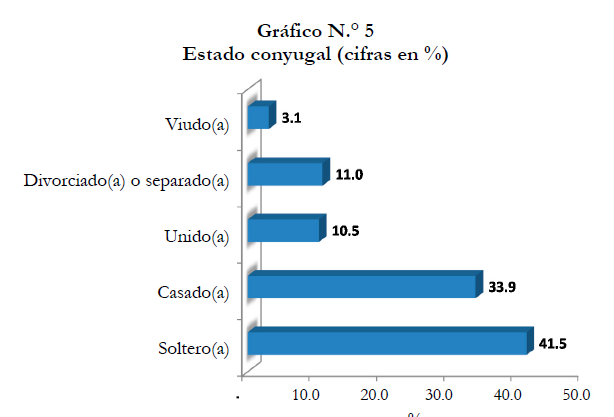 El estado conyugal que predomina en la población emigrante entrevistada es soltero(a) (41.5%). Al incluir las personas divorciadas o separadas y quienes están en condición de viudez, el 55.6% se encuentra sin una pareja. El restante 44.4% está casado y/o unido.