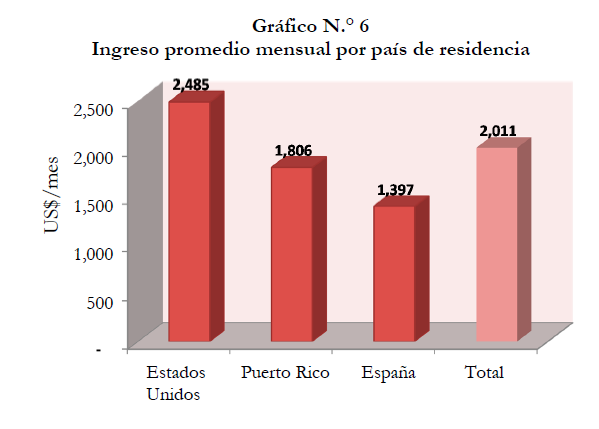 El ingreso promedio mensual percibido en el 2011 por la población entrevistada es de 2,011 dólares y con una mediana de 1,431 dólares. Los mayores ingresos promedio los generan los residentes en Estados Unidos con 2,485 dólares, seguido por Puerto Rico con 1,805 dólares y finalmente España con 1,397 dólares.