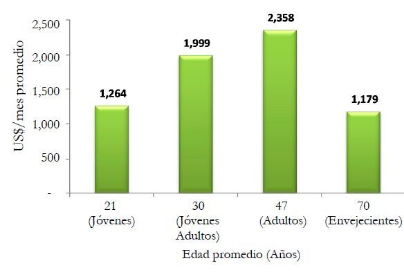 El hombre es quien mayor ingreso mensual genera con 2,372 dólares frente a la mujer con 1,636 dólares. En cuanto al ingreso medio en función de la edad, se observa una tendencia creciente en la medida que transcurren los años hasta alcanzar la edad promedio de 47 años, momento a partir del cual se genera un punto de inflexión y comienza a descender.