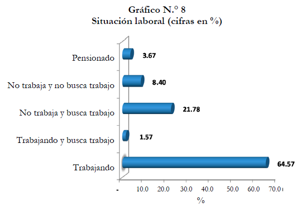 En la encuesta realizada se evalúa la situación laboral acotada tanto a la población económicamente activa (PEA) así como de la población total entrevistada. La PEA, de acuerdo a la Organización Internacional de Trabajo (OIT), se define como “todas aquellas personas que durante el período de referencia especificado pueden clasificarse como personas con empleo o como personas desempleadas, es decir, que aportan al trabajo.”49 En el contexto de la entrevista realizada, se trata de la cantidad total de personas que se encuentran en una de las siguientes condiciones: