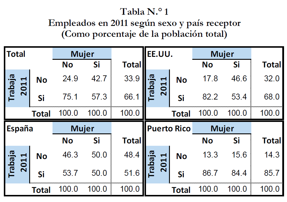 Los resultados revelan que la probabilidad de estar empleado depende (de manera cuadrática) de la edad. La mujer tiene menor probabilidad de estar empleada. El tiempo de residencia influye positivamente en la capacidad de insertarse en el mercado laboral. La educación no tiene una influencia concluyente sobre la probabilidad de estar empleado. Además, se concluye que es más fácil estar empleado en los Estados Unidos y en Puerto Rico que en España. Esto se explica por la mayor flexibilidad del mercado laboral norteamericano.