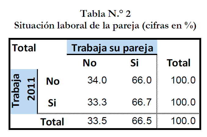 En la encuesta se preguntó sobre algunas características de la pareja del entrevistado. Específicamente se cuestionó sobre la situación laboral, nivel de ingreso y el nivel educativo. La mayoría de las parejas se encontraba trabajando en el 2011 (66.5%), con un ingreso promedio mensual de 2,629 dólares y una mediana de 1,800 dólares. Al descomponer por el género de la pareja, se tiene como resultado que el hombre tiene un ingreso promedio de 3,301 dólares y un porcentaje de estar empleado de 77.9%. La mujer tiene un ingreso promedio de 1,970 dólares y un porcentaje de estar trabajando de un 58.6%. La crisis económica redujo las oportunidades de empleo para las parejas, al pasar el porcentaje empleado48 de 74.8% en 2008 a 66.5% en 2011. Aquellas parejas que no se encontraban trabajando en 2011 indicaron no estarlo por razones personales (40.7%). El 29.6% declaró que nunca ha trabajado y el 7.4% de las parejas que no estaba trabajando indicó que perdió el empleo. En cuanto a nivel de educación, el 50.9% de las parejas posee educación secundaria o menos. La pareja masculina tiene en promedio mayor nivel de educación. El 42.4% de los hombres tiene un nivel de educación igual o inferior a secundaria, en contraste con el 56.6% de las mujeres.