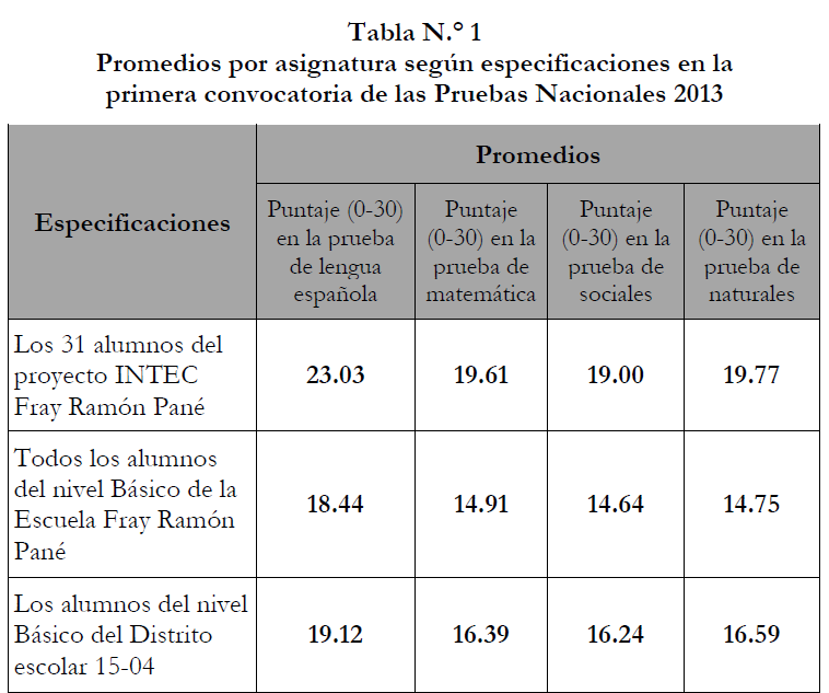 Una de las principales fortalezas detectadas tiene que ver con los resultados del programa en los aprendizajes de los y las estudiantes. Al comparar la media de los puntajes obtenidos en las cuatro áreas evaluadas por Pruebas Nacionales por los estudiantes del programa, con la media de la Escuela Fray Ramón Pané y con la media del Distrito Educativo 15-04, se observan diferencias claras a favor del estudiantado del programa, ya que los estudiantes del Programa sobrepasan a los de la escuela regular, y a los resultados distritales.