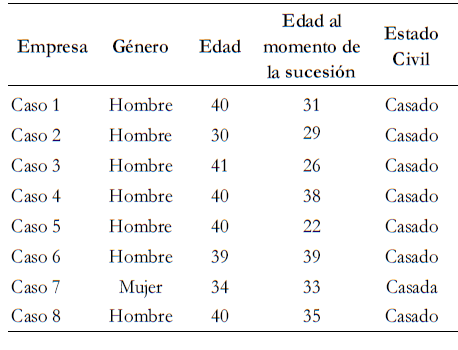 En todos los casos el sucesor ha sido entrenado dentro de la empresa. Sin embargo, en ningún caso se tenía un plan definido de relevo salvo en uno, pues en la mayoría se fue dando de manera espontánea, pero tampoco porque haya sucedido algún incidente (e.g. divorcio, enfermedad, muerte de familiares). De los sucesores (ver cuadro N.° 5), seis de las ocho empresas se encuentran dirigidas por la segunda generación, mientras que dos de ellas van por la tercera generación. Todos los participantes tienen grados académicos de maestrías, exceptuando uno, el cual tiene un grado académico universitario.