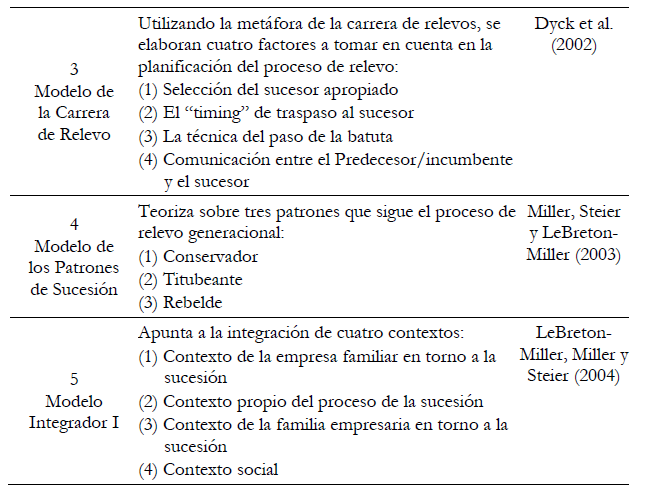 Otro grupo de modelos (2, 5, 6, 8, 10) se enfocan en las relaciones que interactúan en el complejo proceso de relevo generacional de las empresas familiares girando alrededor de cuatro pilares: La empresa, los grupos de interés, el incumbente/predecesor y el sucesor. Es abordado desde una perspectiva integral (Fox, Nilakant, & Hamilton, 1996; Chitoor y Das, 2007); incluyendo el contexto socio‐cultural y ambiental (LeBreton-Miller, Miller & Steier, 2004); subrayando el punto de vista solo del sucesor (Venter et al., 2005);o destacando aspectos aislados de uno o dos de los pilares mencionados (Solomon et al., 2011).