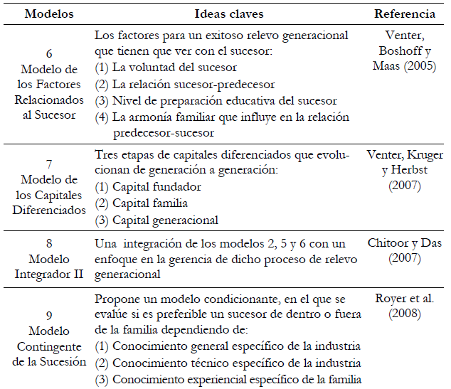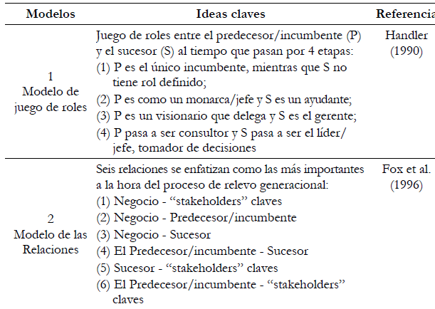 Modelos del proceso de relevo generacional, ideas claves y sus referencias