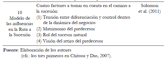 Finalmente, dos modelos abordan la problemática del relevo aspirando a una tipificación simplificada del proceso (4, 9). Uno, de acuerdo a si es conservador, titubeante o rebelde el curso que sigue el sucesor con referencia al paradigma que le antecede en casi todos los órdenes de la vida del negocio (Miller, Steier & LeBretonMiller, 2003); y el otro, de acuerdo al tipo de conocimiento (general, técnico, experiencial) para determinar si el sucesor idóneo debe buscarse fuera o al interior de la familia (Royer, Simons, Boyd & Rafferty, 2008).