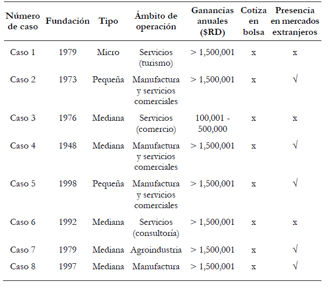 Una de ellas tiene más de 60 años de antigüedad, cuatro de ellas alrededor de 40 años y las tres restantes son de la década de los 90. Tres del total son del sector de servicio, tres pertenecen tanto al sector de servicios como al de manufactura y una al sector agroindustrial. Cinco de ellas se pueden clasificar como medianas empresas, de acuerdo a la cantidad de empleados; mientras que dos son pequeñas y una de ellas es micro empresa. Todas, excepto una, tienen ganancias anuales que superan los 1.5 millones de pesos dominicanos; y cinco de las ocho, tienen presencia en mercados internacionales.