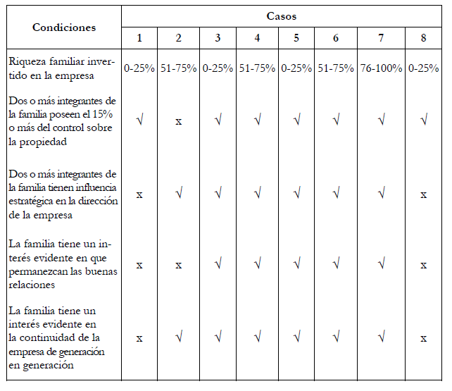 La condición del control sobre la propiedad es la más común de todas, seguida de la influencia estratégica y el interés por la continuidad. Sin embargo, el interés evidente en que permanezcan las buenas relaciones familiares, fue la condición relativamente menos común de todas entre las ocho empresas bajo estudio.