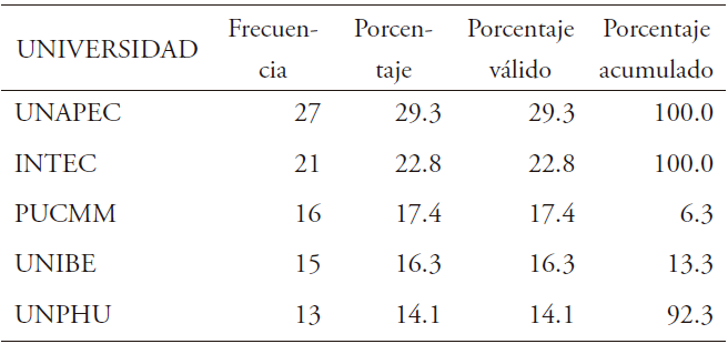 El análisis se basa en fuentes de información primaria, con las bases de datos del registro de los estudiantes que han emprendido una iniciativa o algunos proyectos innovadores. La población de la investigación fue escogida de la lista de estudiantes que han tenido iniciativas emprendedoras. Esta lista fue distribuida para cada responsable de los centros de emprendimientos de las universidades seleccionadas. La población consultada representa un total de 92 estudiantes emprendedores que pertenecen a diferentes universidades ubicadas en Santo Domingo, República Dominicana. La distribución de la población por universidades se presenta en la siguiente tabla: