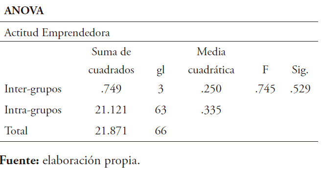 Cuando se evaluó la diferencia por comparación de medias entre la actitud emprendedora y el nivel de avance en la carrera, se observó que el nivel de significancia es superior a 0.005, por lo tanto, se acepta la hipótesis nula 1d de que no hay diferencias significativas en la actitud emprendedora de estudiantes con diferentes niveles de avance en la carrera que estudian.