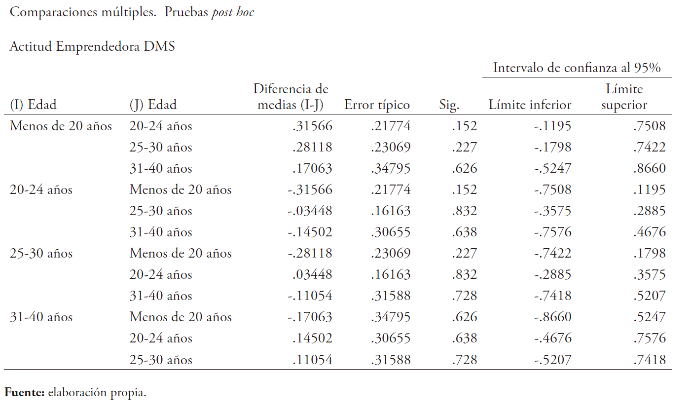 Edad: examinando la edad del emprendedor universitario con relación a la actitud emprendedora, como se presenta en las tablas 2, 3 y 4, se evidencia que no hay diferencias significativas entre grupos de edades y actitud emprendedora; de igual manera, tampoco existen diferencias importantes entre esos grupos de edades y la actitud emprendedora por universidad.