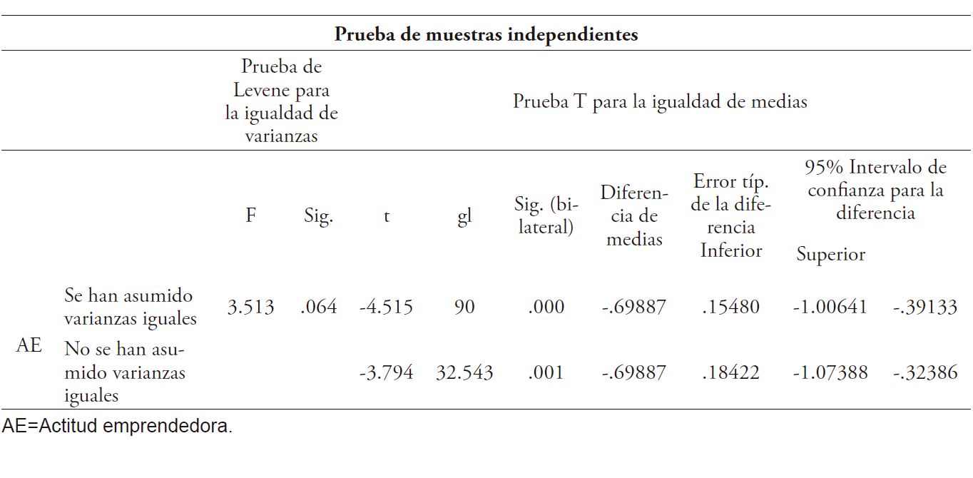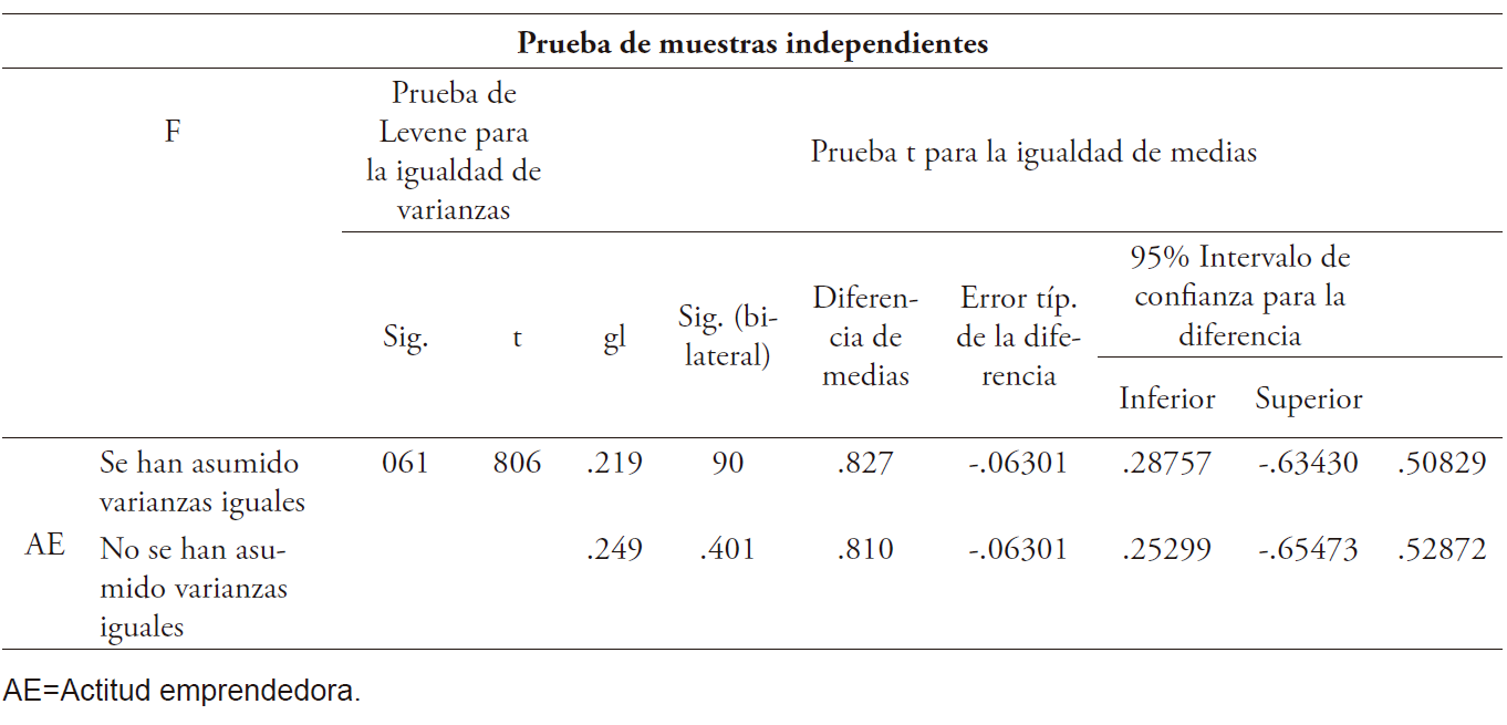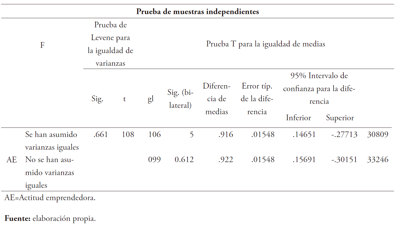 Tabla 5. Prueba de muestras independientes (t) entre actitud emprendedora y género