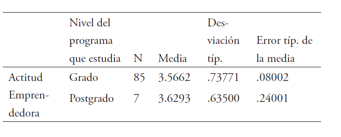 En el caso de la comparación de las medias de los estudiantes que cursan el nivel de grado con los estudiantes que cursan el nivel de postgrado, se observa en la tabla 6 que existe una diferencia muy mínima (0.0631) en la media de los diferentes grupos de estudiantes de grado (3.5662) y postgrado (3.6293), con relación a su actitud emprendedora, siendo la media de postgrado un poco superior; sin embargo, esta diferencia no es significativa, como se evidencia en la tabla 7 de la prueba t de muestras independientes, por lo que se rechaza la hipótesis nula que establece que los estudiantes de nivel de grado tienen menor actitud emprendedora que los esTudiantes del nivel de postgrado.