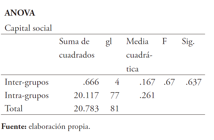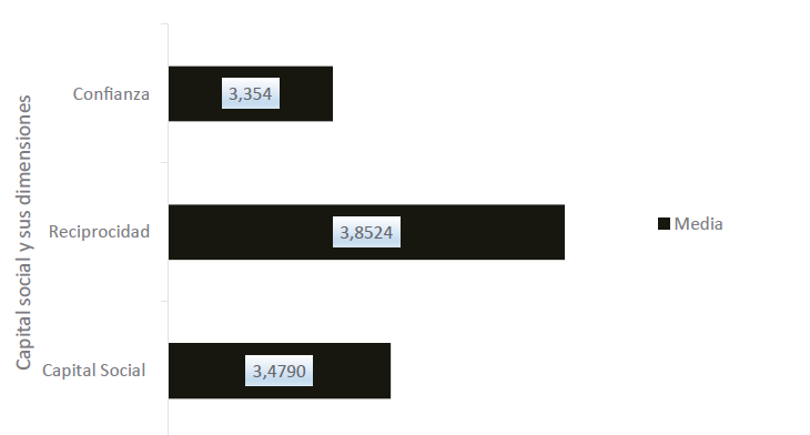 Como se muestra en la figura 1, la media es superior al punto medio de la escala, tanto en el capital social, que promedió 3.4790, como en cada una de las dimensiones que lo componen. La reciprocidad fue el factor más valorado de las diferentes dimensiones del capital social. Alcanzó un valor promedio de 3.8524, en una escala de 1 a 5 donde 1 = bajo, 3 = medio, 5 = alto. Lo que significa que el 77.048% de los participantes del estudio se perciben son recíproco en su comportamiento.