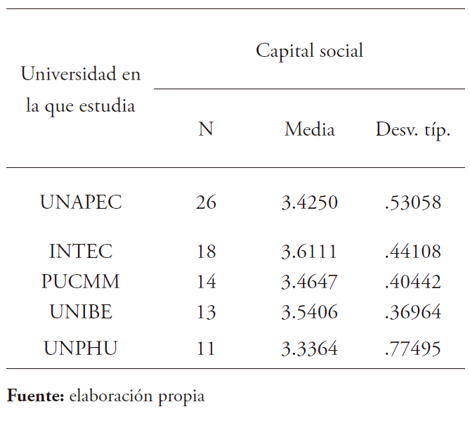 Analizando la tabla 9, en el caso del capital social, todos los emprendedores de las universidades participantes superan la media superior de la escala de 1 a 5, donde 1 = bajo, 3 = medio, 5 = alto. Los resultados de las medias de las diferentes universidades oscilan en valores comprendidos entre 3.6111 y 3.3364.