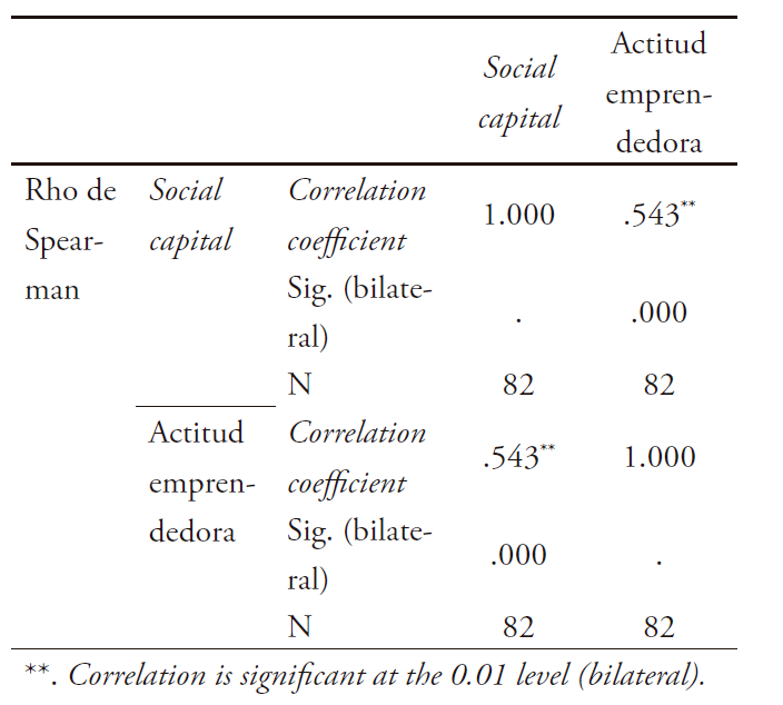 Tabla 10. Coeficiente de correlación de Spearman entre capital social y actitud emprendedora