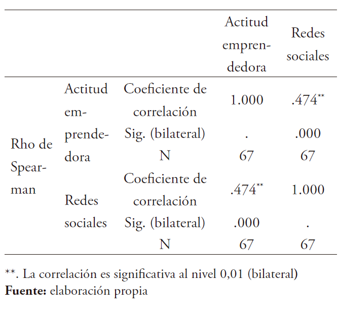 Las redes sociales como medio para compartir y transferir conocimiento y experiencia, así como para fomentar el trabajo colaborativo, explican favorablemente la actitud emprendedora, al igual que el entorno familiar. Aquellos estudiantes que cuentan con familiares y amigos cercanos que tienen empresas presentan mayor desarrollo en su actitud emprendedora.
