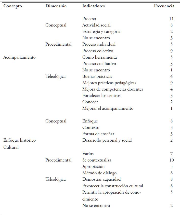 Los resultados se organizan en tres dimensiones: conceptual, metodológica y teleológica. En la dimensión conceptual se hallaron tres indicadores, mientras que tanto en la metodológica como en la teleológica se encontraron cuatro indicadores.